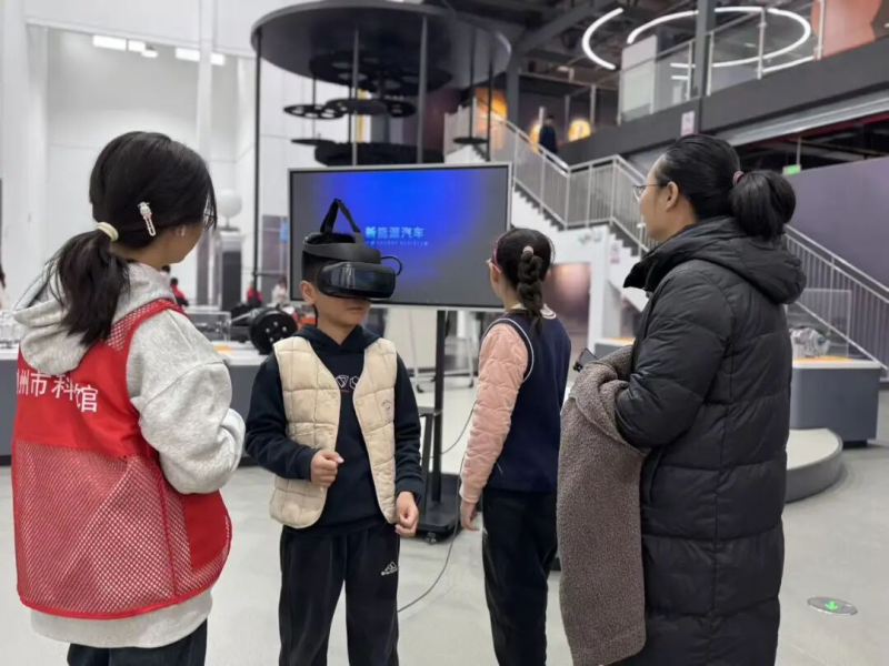 在VR眼镜展区,小讲解员佩戴设备后介绍“VR画面展示了新能源汽车的核心部件——动力电池、驱动电机和电控系统,它依靠电能驱动,不依赖燃油,能减少碳排放,其能量转化效率比传统燃油车更高,这是它的核心环保优势。”