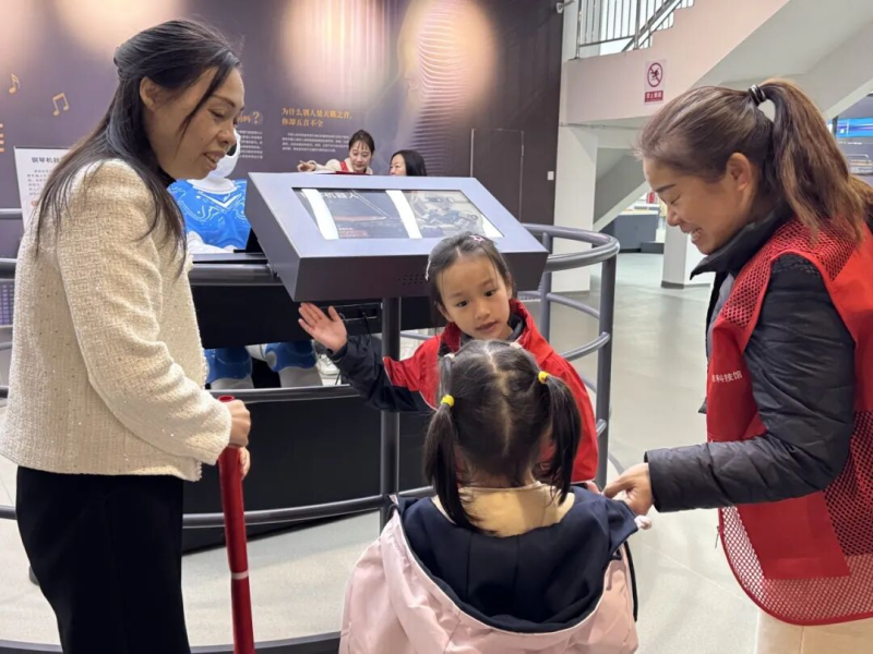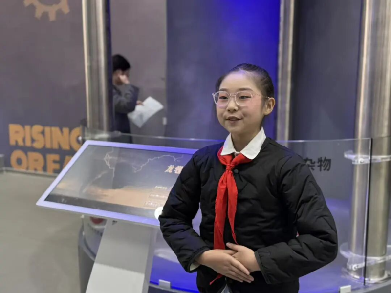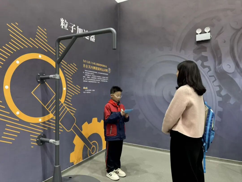 面对粒子加速器展品,小讲解员指着模型结构讲解:“它的核心功能是利用电磁场对微观粒子(如质子、电子)进行加速,使其获得极高能量,为科学家研究物质微观结构、探索宇宙起源提供实验条件,我们看到的管道,就是粒子加速运动的轨迹通道。”