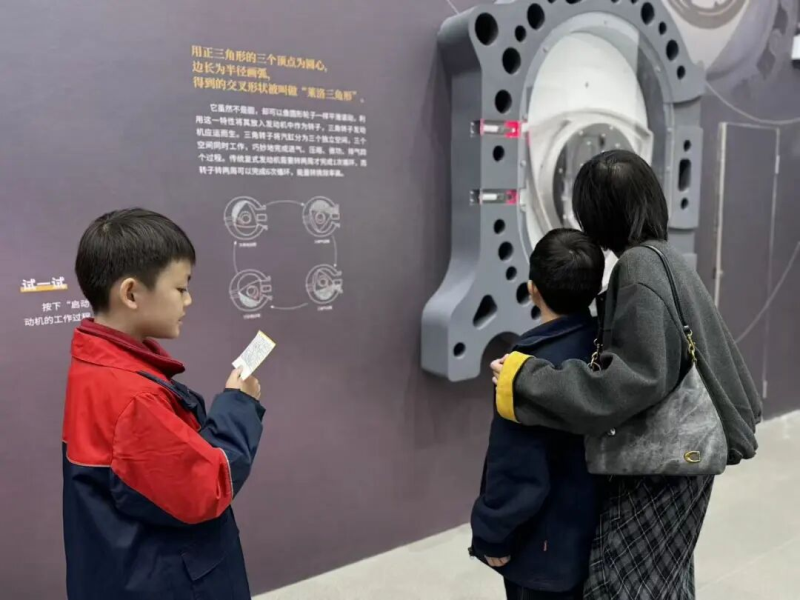 走到转子发动机展区,孩子聚焦动态模型分析:“与传统往复活塞发动机不同,转子发动机通过三角转子在缸体内的偏心旋转,实现进气、压缩、做功、排气四个冲程,其结构更紧凑,动力输出更平顺,广泛应用于部分高性能交通工具。”