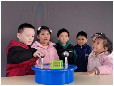 在静电体验环节,孩子们排队体验专业静电仪,亲身感受静电产生的奇妙张力,在惊奇欢呼中初步感知电荷的神秘力量。